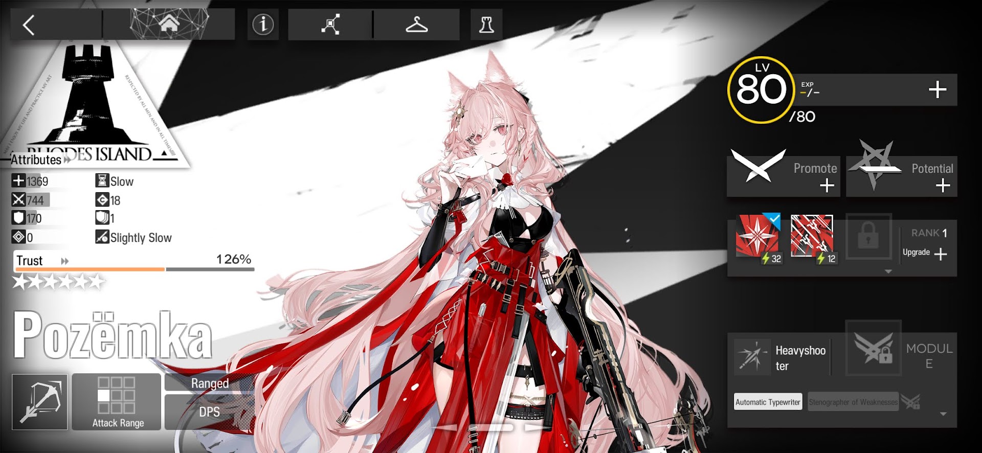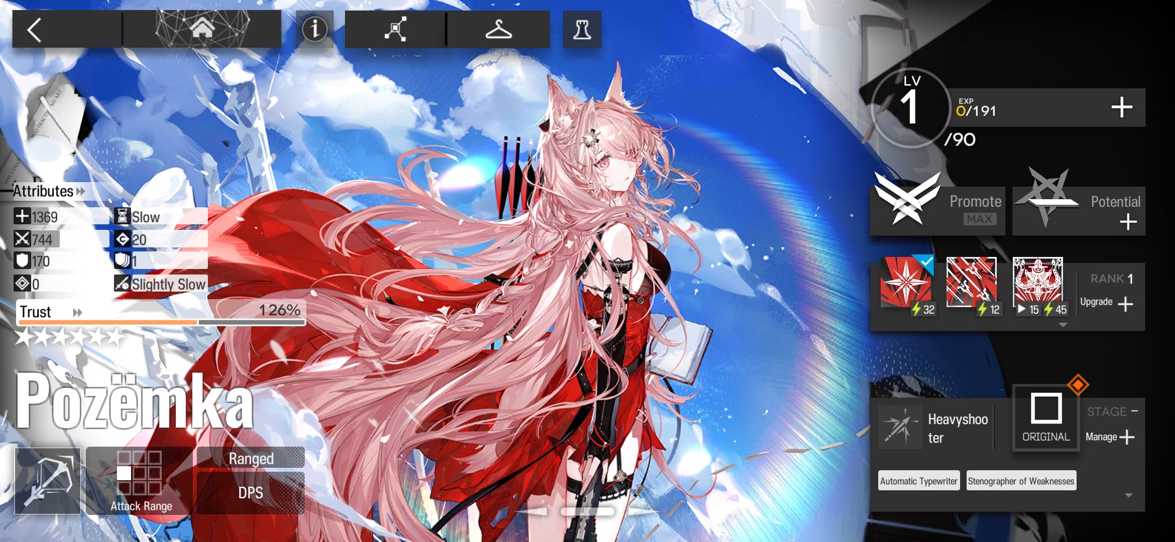 Pozyomka is a Heavyshooter Sniper who utilizes her skills and summon to deal high amounts of damage at a medium range in a straight line ahead of her. Her range is already quite flexible for the damage she offers, but she’s also capable of placing a Typewriter to engage enemies from any deployable ranged tile, making for an easy-to-set-up duo. With proper positioning, she and her summon can deal with even high-priority targets relatively quickly thanks to high multipliers and a powerful DEF debuff.
