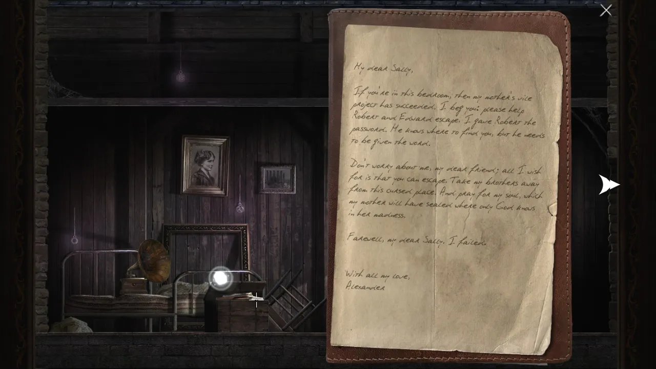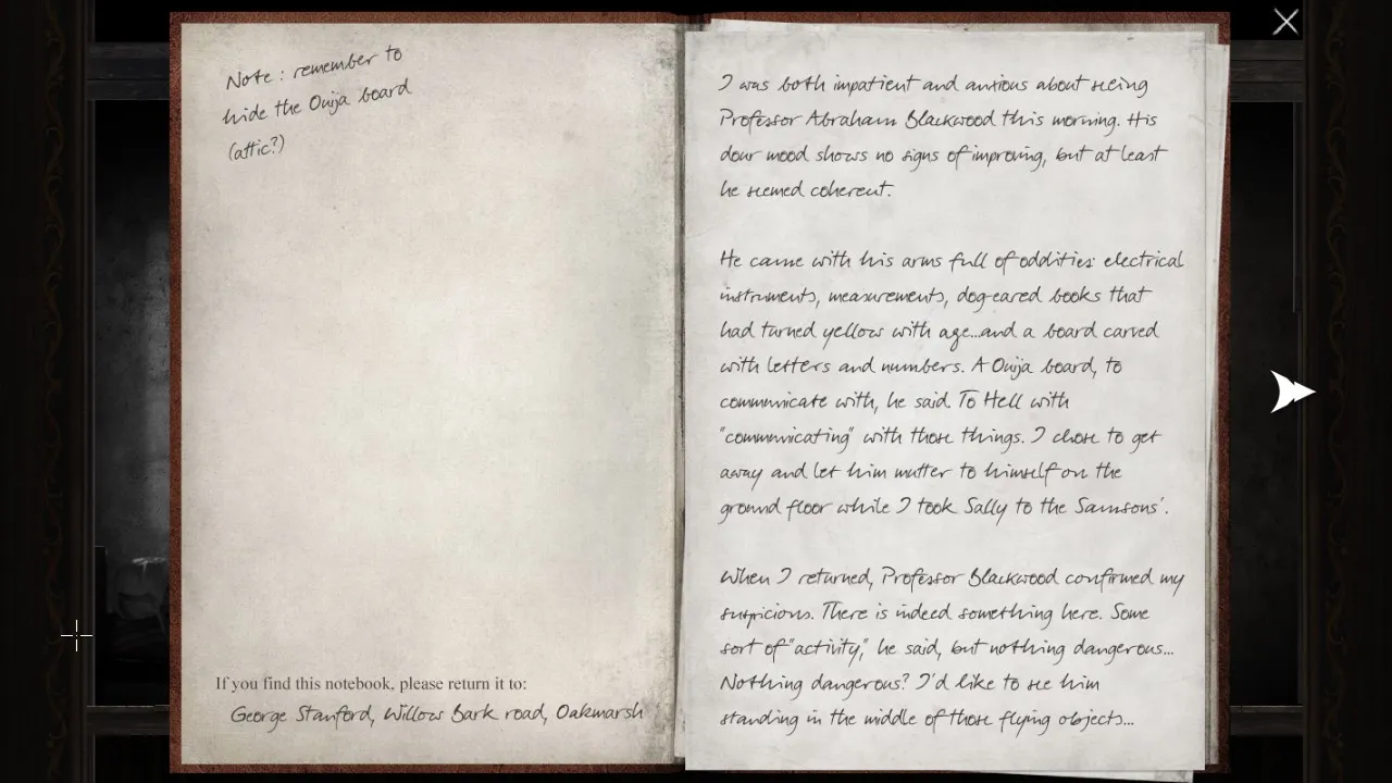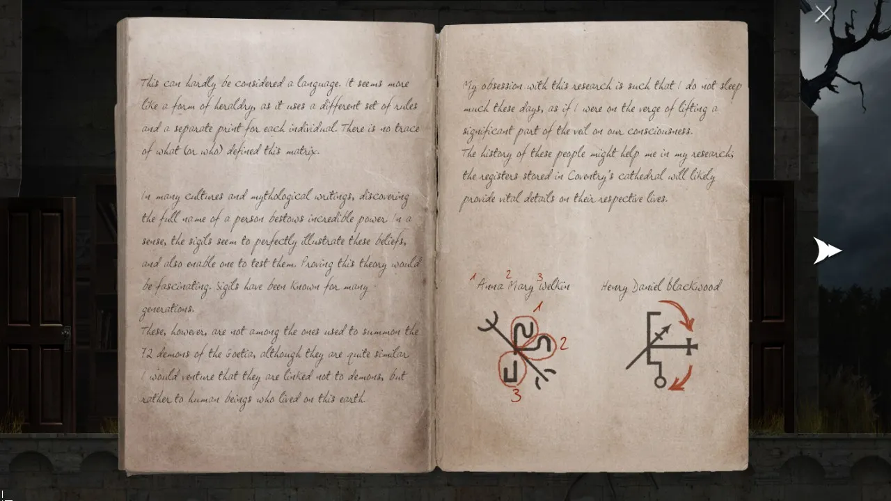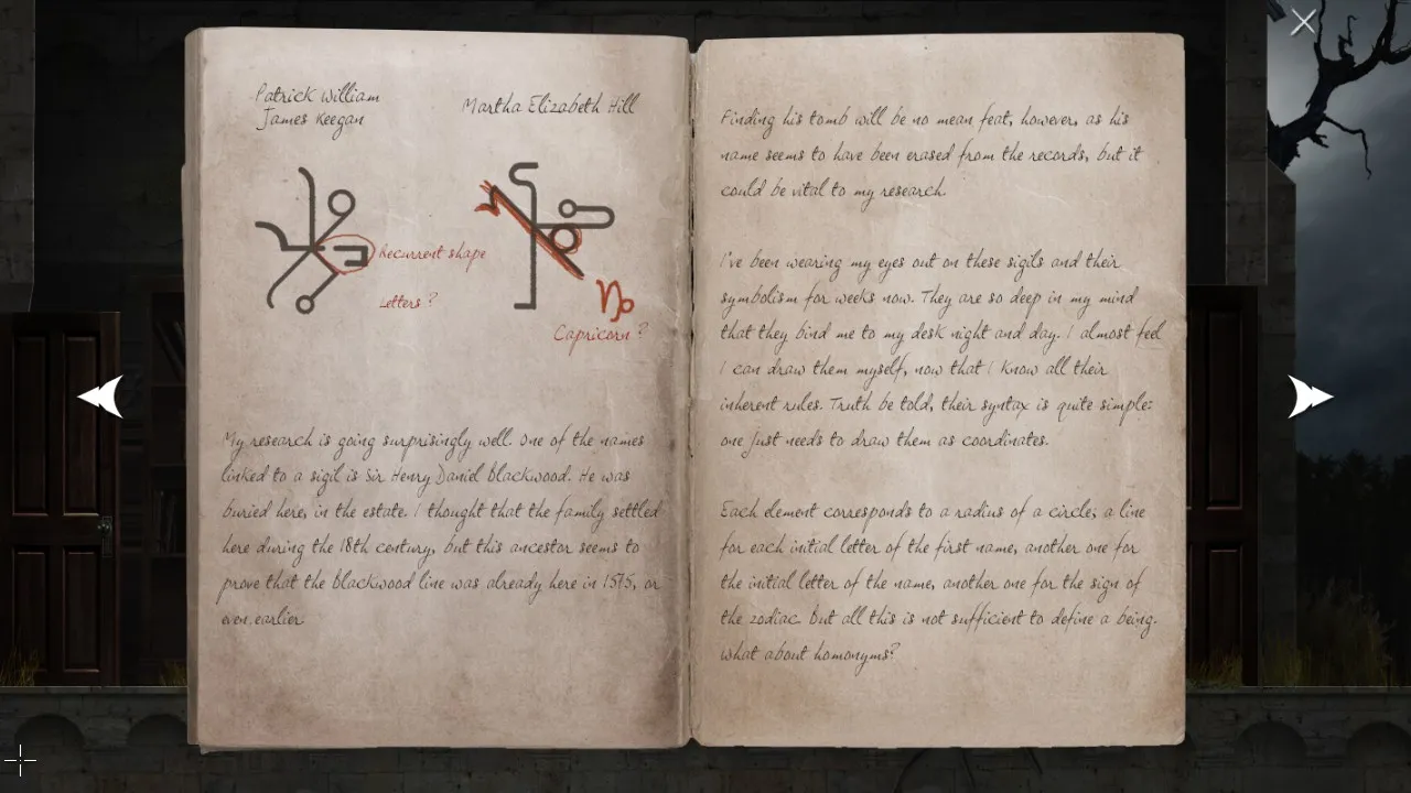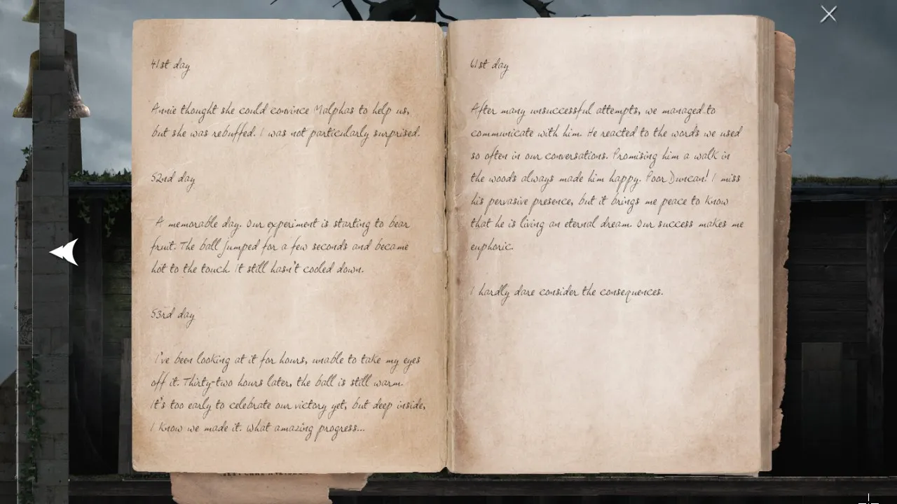 - Return to office with puzzle box. Pick up journal. Carry journal outside, towards the forest. Secret brick now revealed.