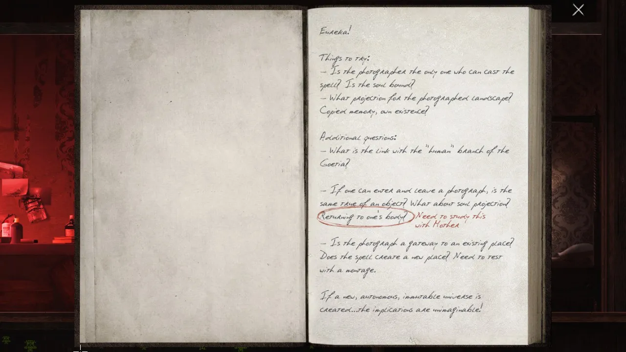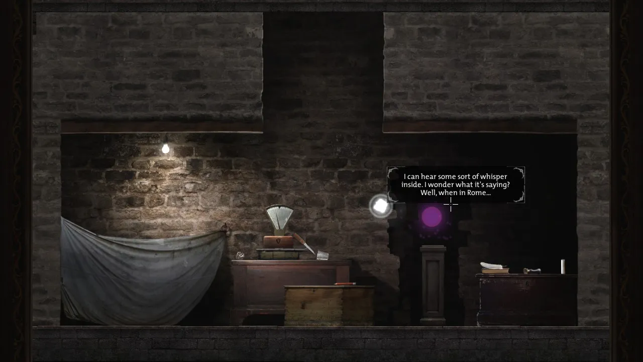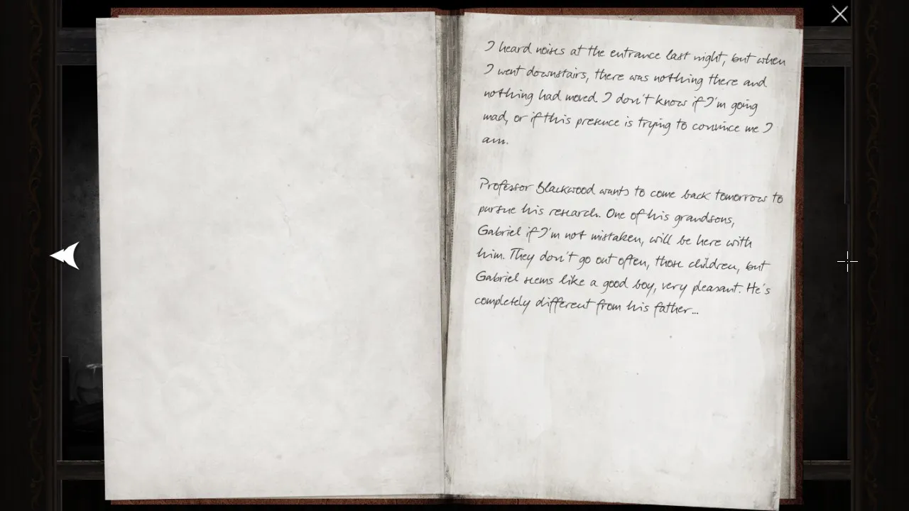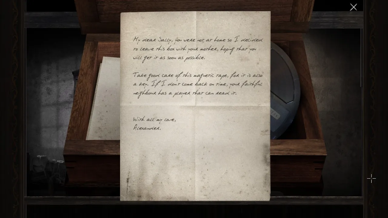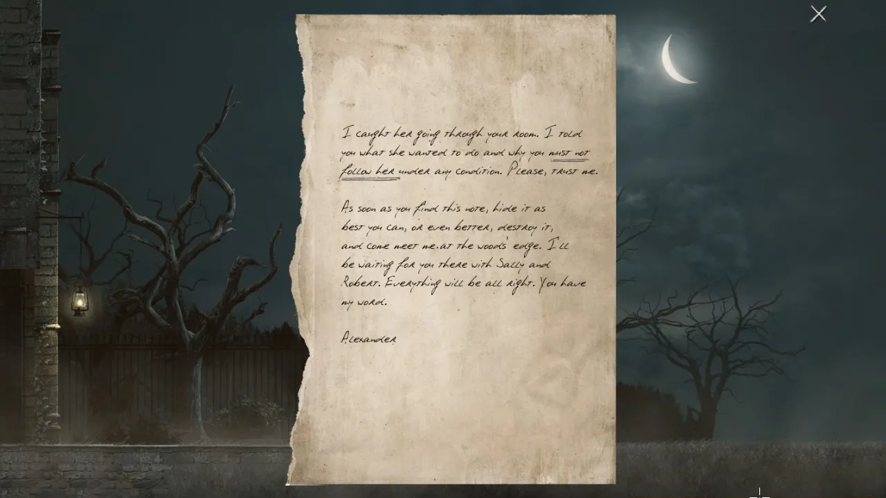 - Return to office with puzzle box. Pick up journal. Carry journal outside, towards the forest. Secret brick now revealed.