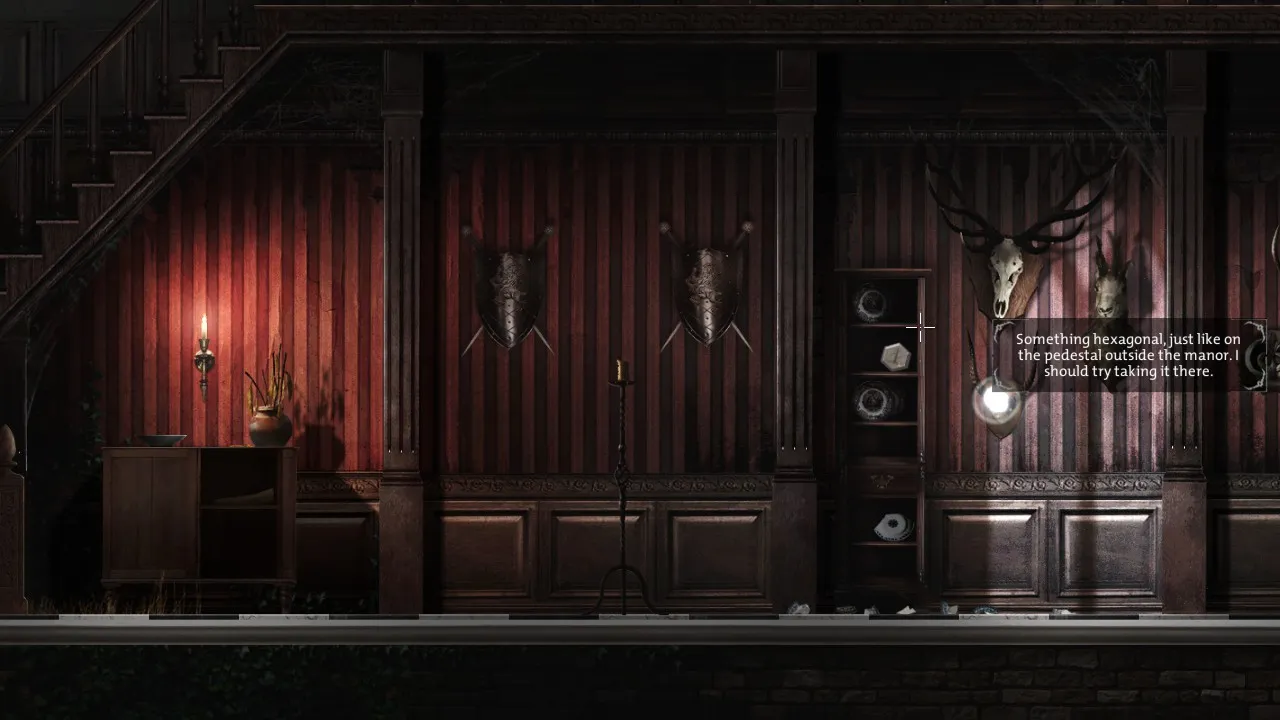 - Note broken crockery near front door. Find hexagonal shape.