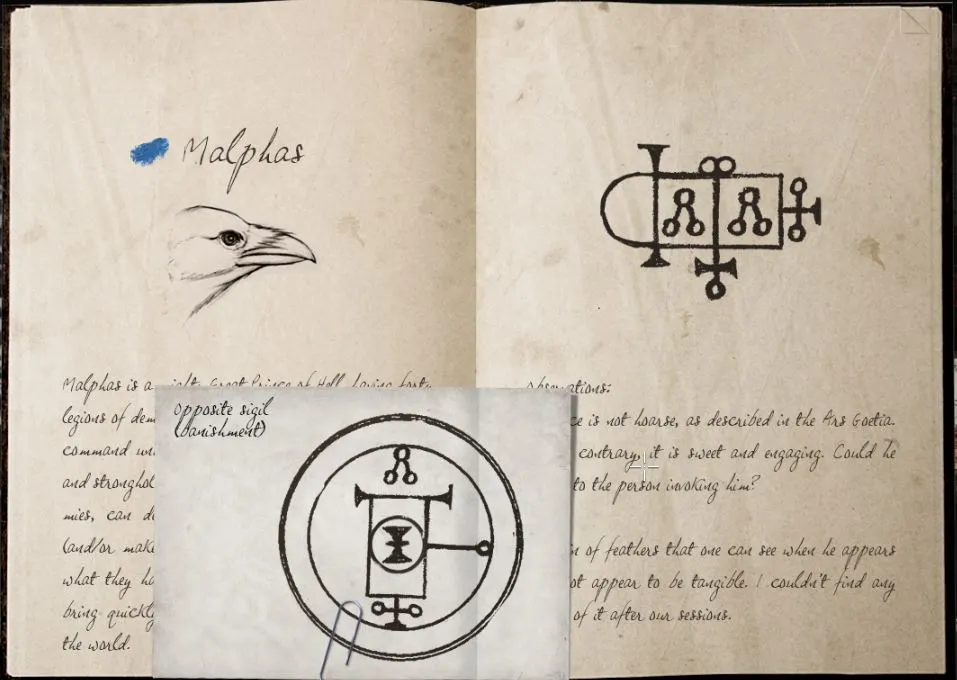 Codex: Malphas, opposite sigil. Steam Achievement: “Apprentice exorcist First attempt at banishing a demon.” You may now fly through walls previously blocked by blue symbols.