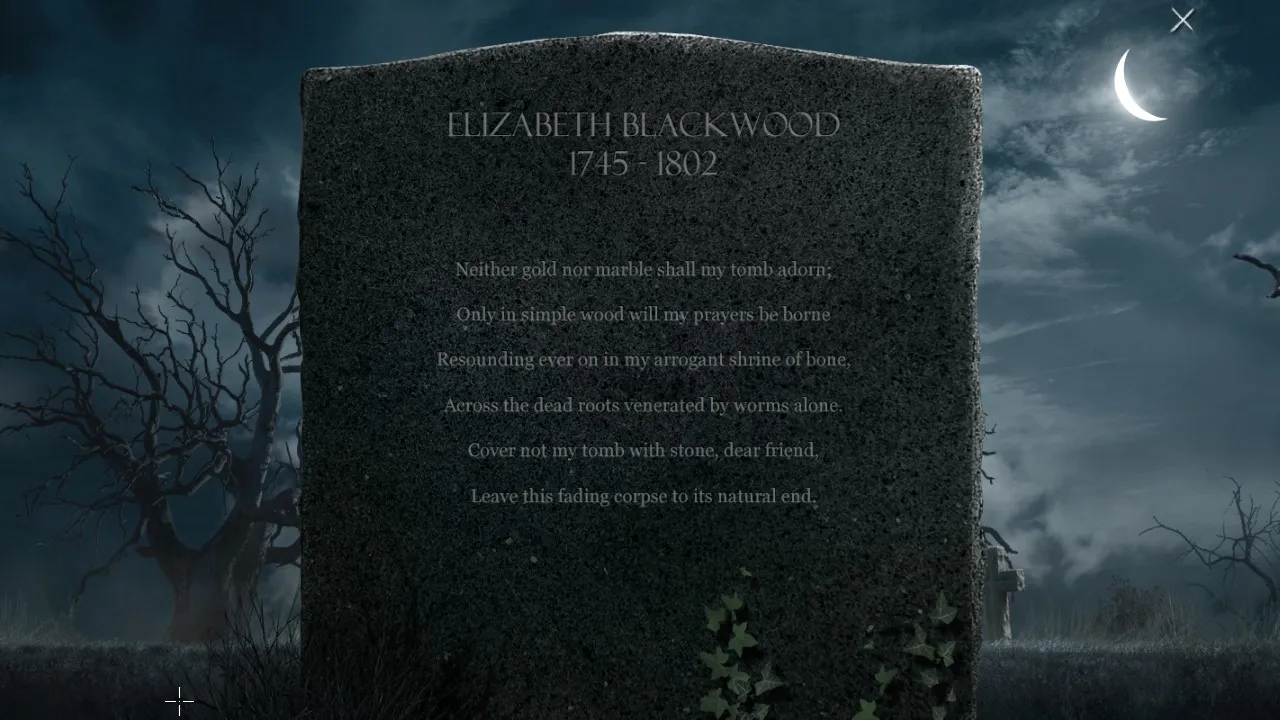 Fly down into graves. Find key. Fly key up to the second floor and in through open window.